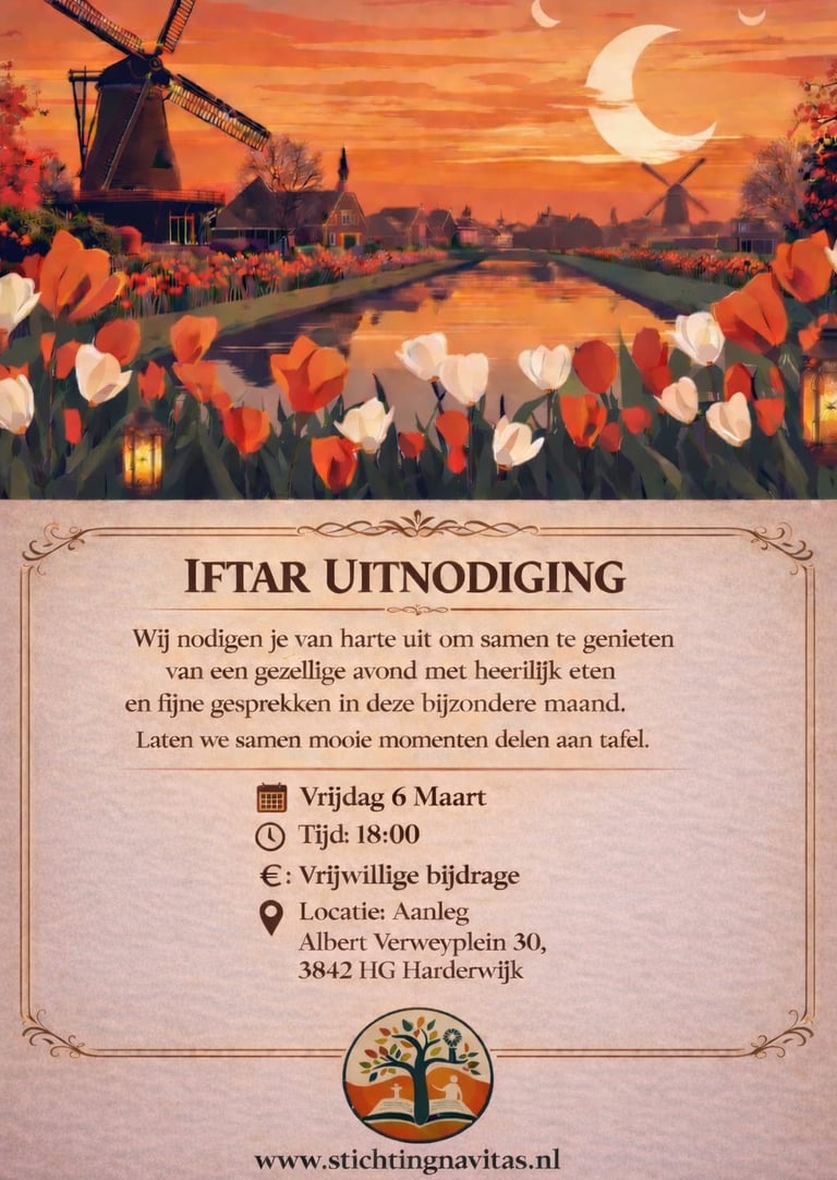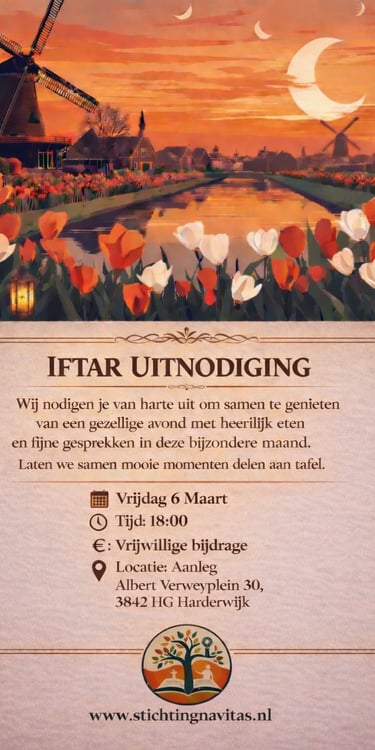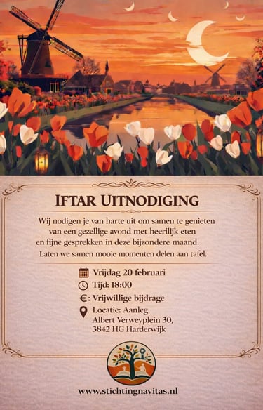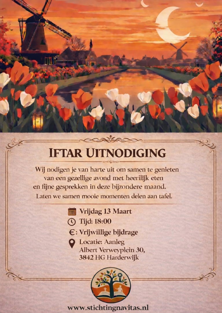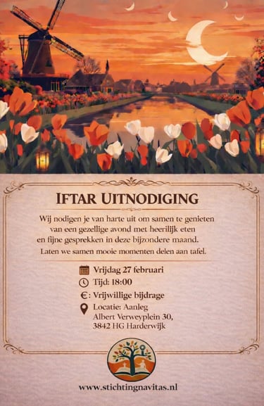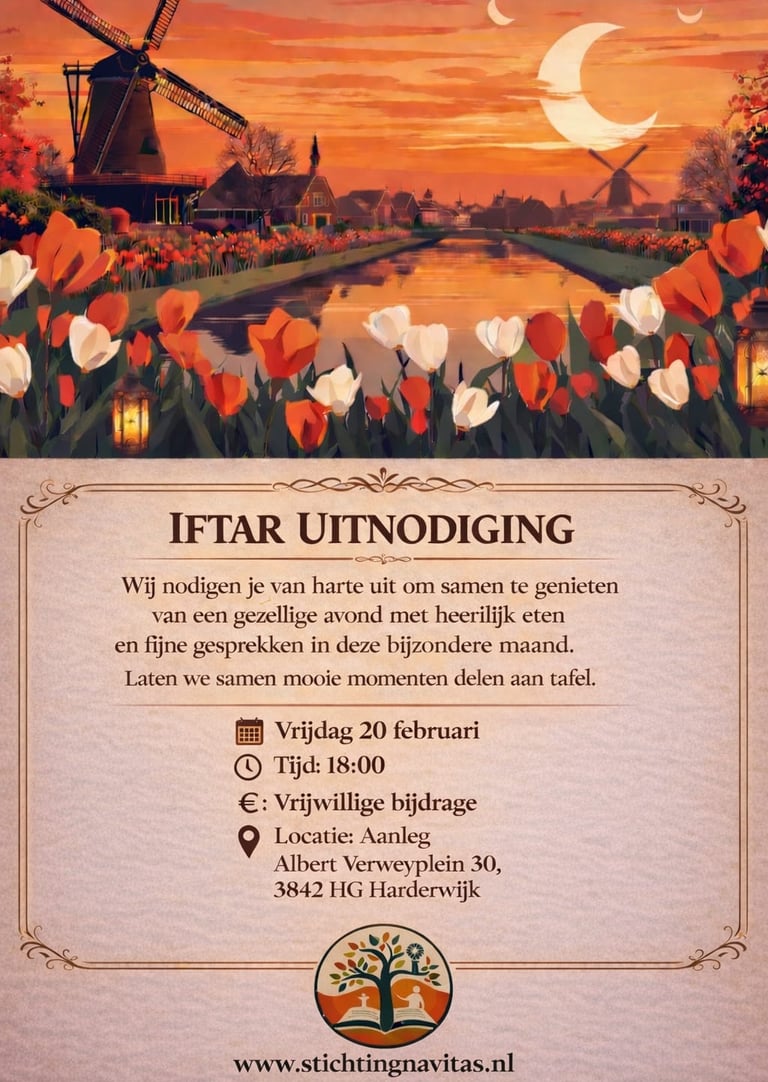 De Stichting Navitas opent, zoals altijd, ook dit jaar haar hart en haar tafels voor u. Ter gelegenheid van de Ramadan verwelkomen wij met veel plezier onze gewaardeerde Nederlandse inwoners, buren, vrienden en kennissen om samen deze bijzondere maand te beleven. Wat is de Ramadan? De Ramadan is voor moslims een heilige maand waarin spiritualiteit, geduld, solidariteit en delen centraal staan. Door te vasten leren mensen dankbaarheid, empathie en verdraagzaamheid. Betekenis van het Samen Iftar Vieren De iftar is het moment waarop het vasten gezamenlijk wordt verbroken. Samen aan tafel zitten versterkt vriendschappen, bevordert onderlinge verbondenheid en brengt verschillende culturen dichter bij elkaar. Wij nodigen u van harte uit op: 📅 Vrijdag 20 februari 📅 Vrijdag 27 februari 📅 Vrijdag 6 maart 📅 Vrijdag 13 maart 📍 Albert Verweyplein 30, 3842 HG Harderwijk Wij kijken ernaar uit u te mogen verwelkomen. U bent van harte welkom!